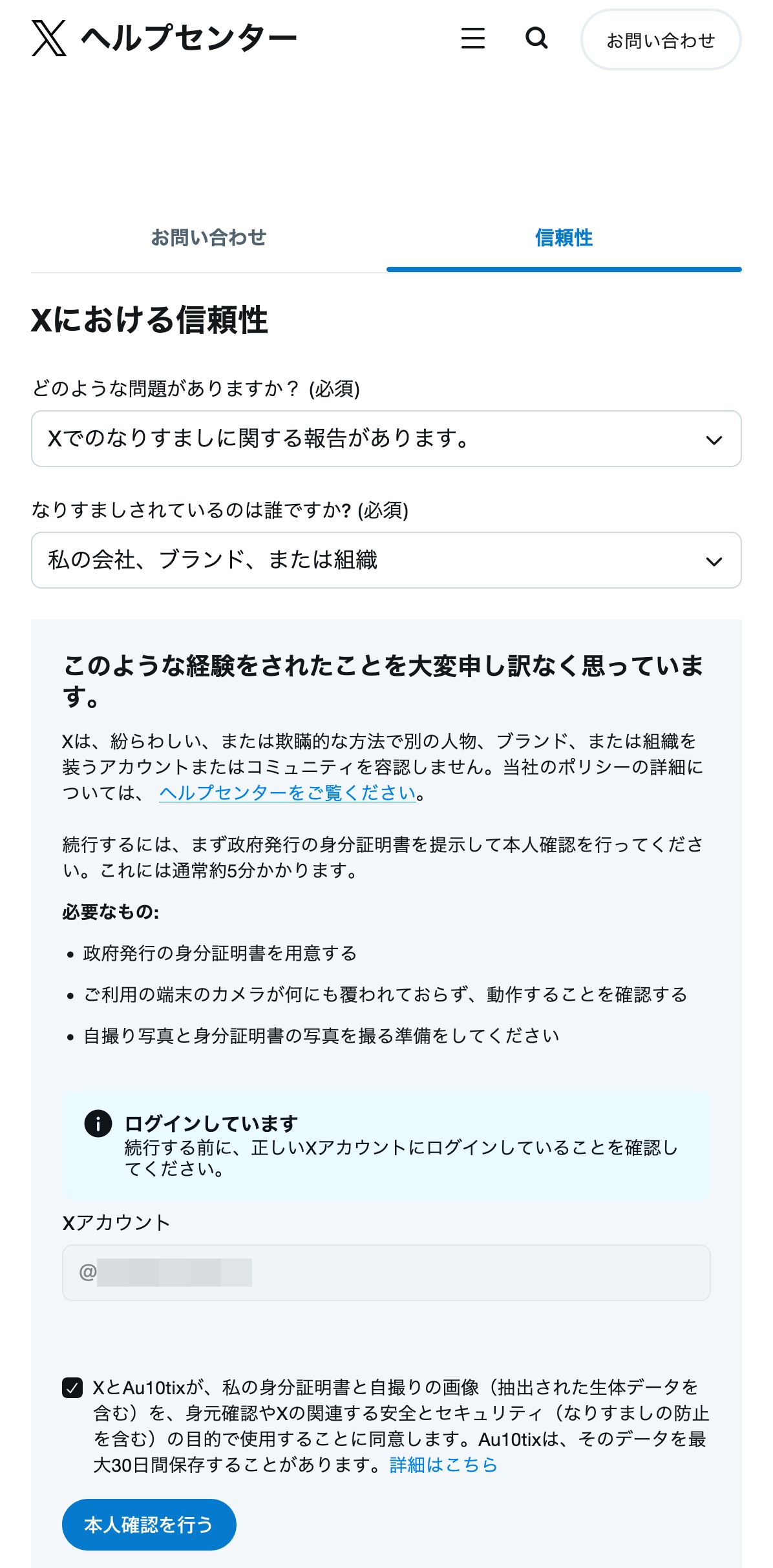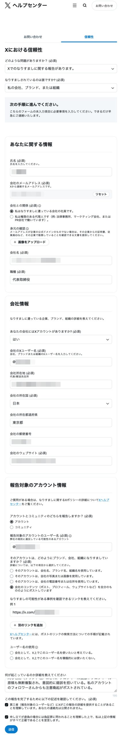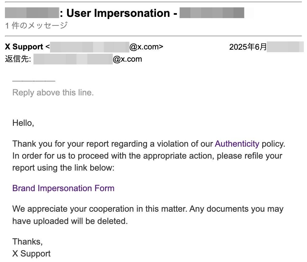 半日経って(約15時間後)、Xからメールが届きました。なんと「Brand Impersonation Form」から再度、フォームをやり直してくださいとのこと。「Brand Impersonation Form」といっても前述の「Xの信頼性」フォームと基本的には同じフォームで、「なりすましされているのは誰ですか?」の項目について「私の会社、ブランド、または組織」を選択した状態のことを指していました。