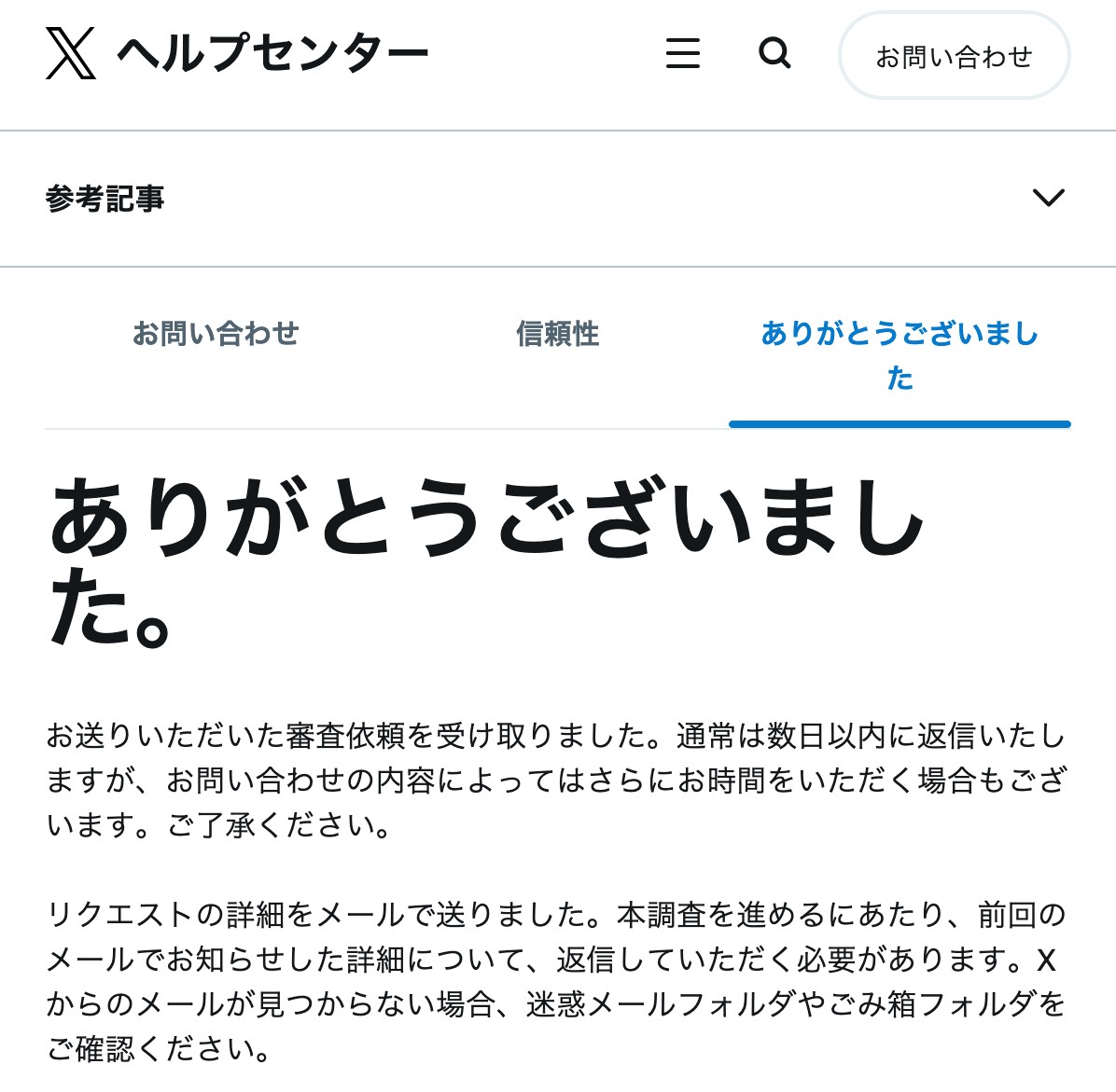 「送信」が終わると前述同様、下記のような表示となり、フォームの手続きは完了、Xからのメールや対応を待ちことになります。 同様に「X Support」からメールでも報告を受けた旨の自動送信メールが届きます。