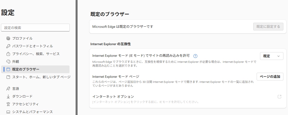 - 「Edge」ブラウザを起動し、右上三点リーダー「設定」から「既定のブラウザー」で「Internet Explorerの互換性」の「Internet Explorerモード(IEモード)でサイトの読み込みを許可」が「既定」となっていることを確認します。
