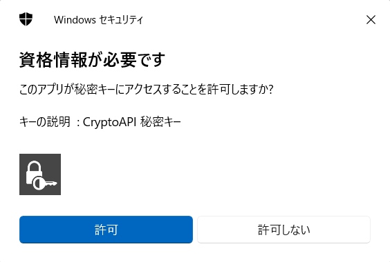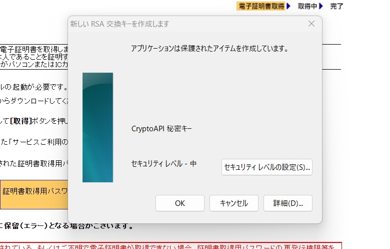 - 「新しいRSA交換キーを作成します」としてセキュリティレベルや資格情報の画面が表示されるので「OK」や「許可」を押して進んでいくと一通りの設定作業が完了。