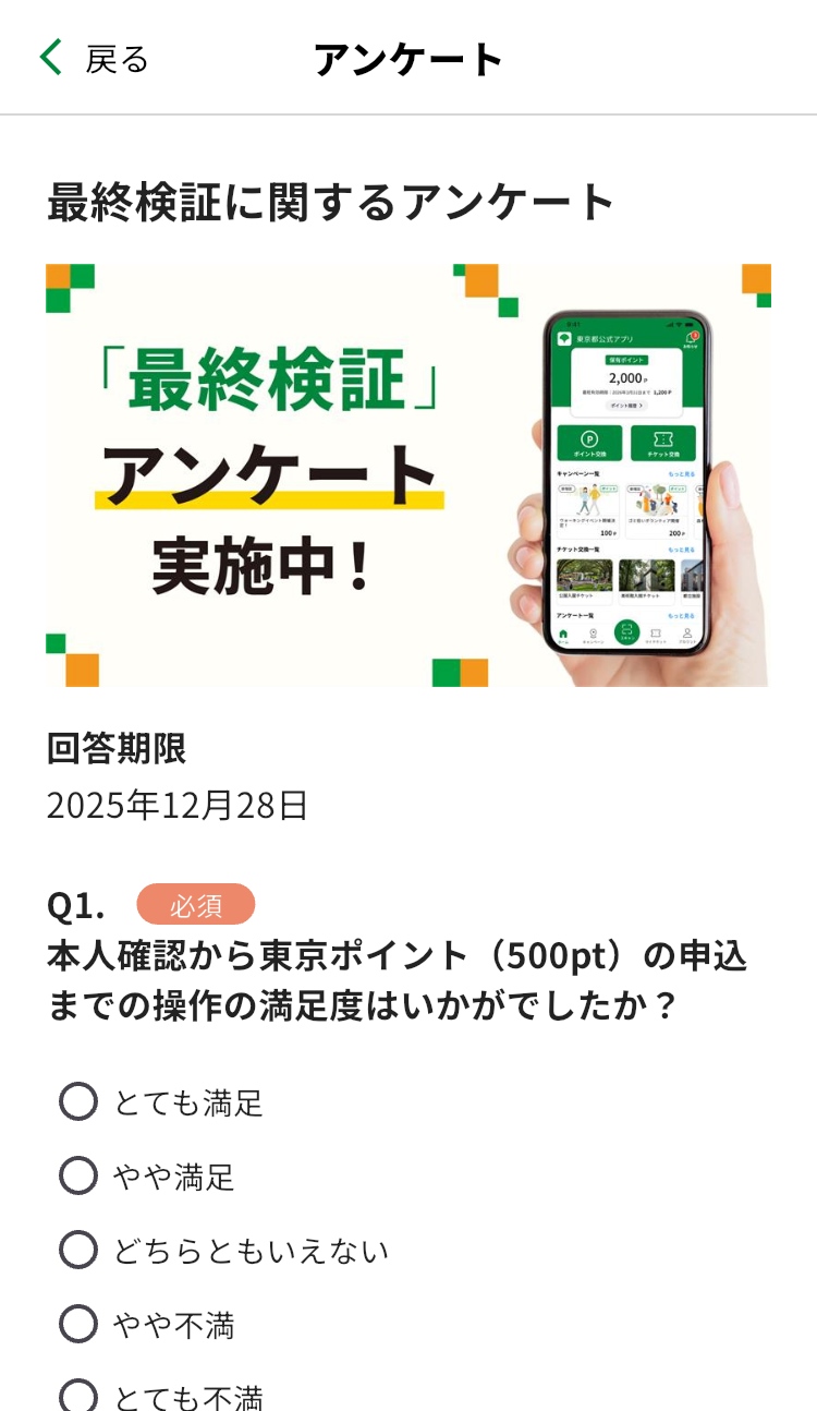 - アプリのホーム画面の「アンケート一覧」から「最終検証に関するアンケート」を選択して回答。