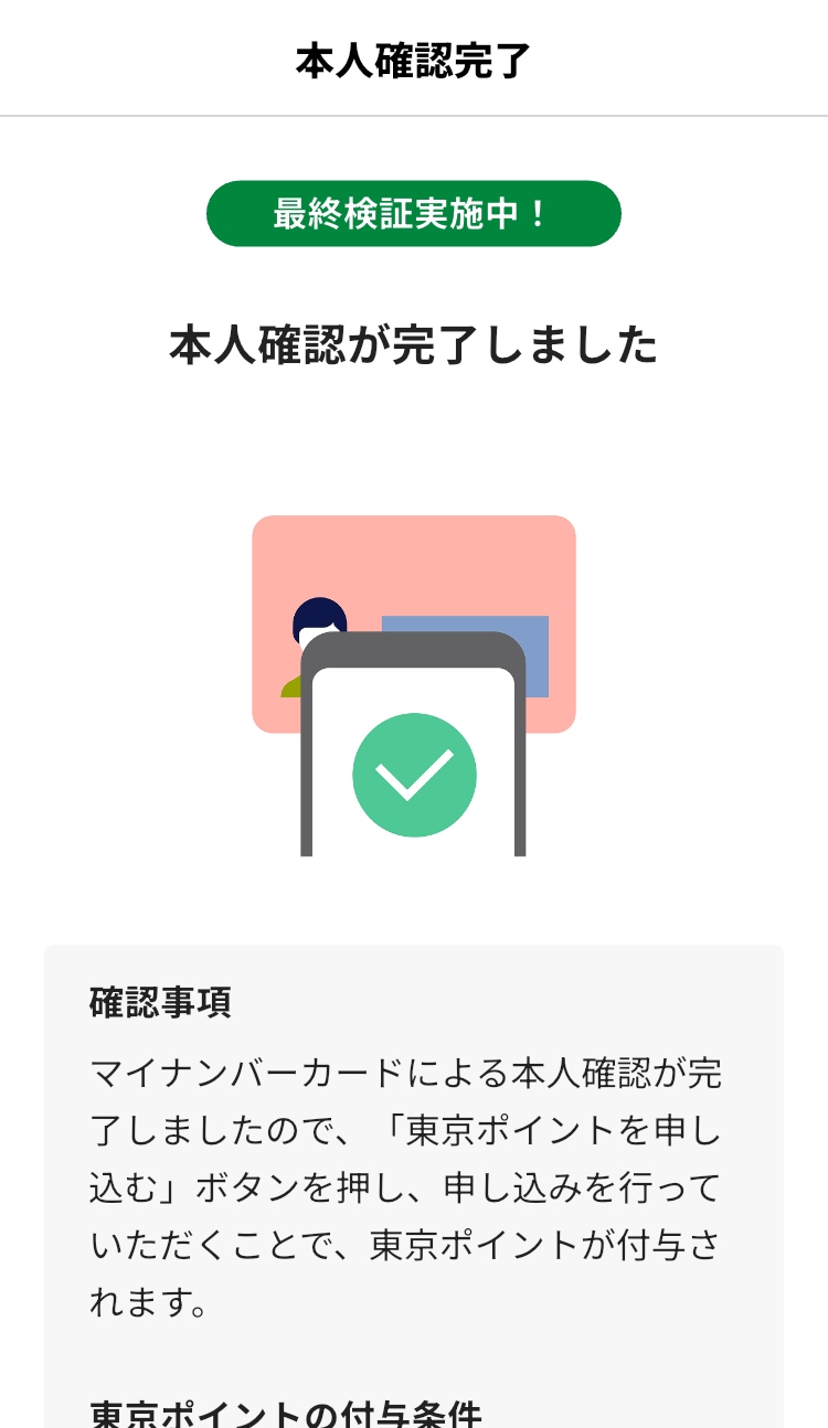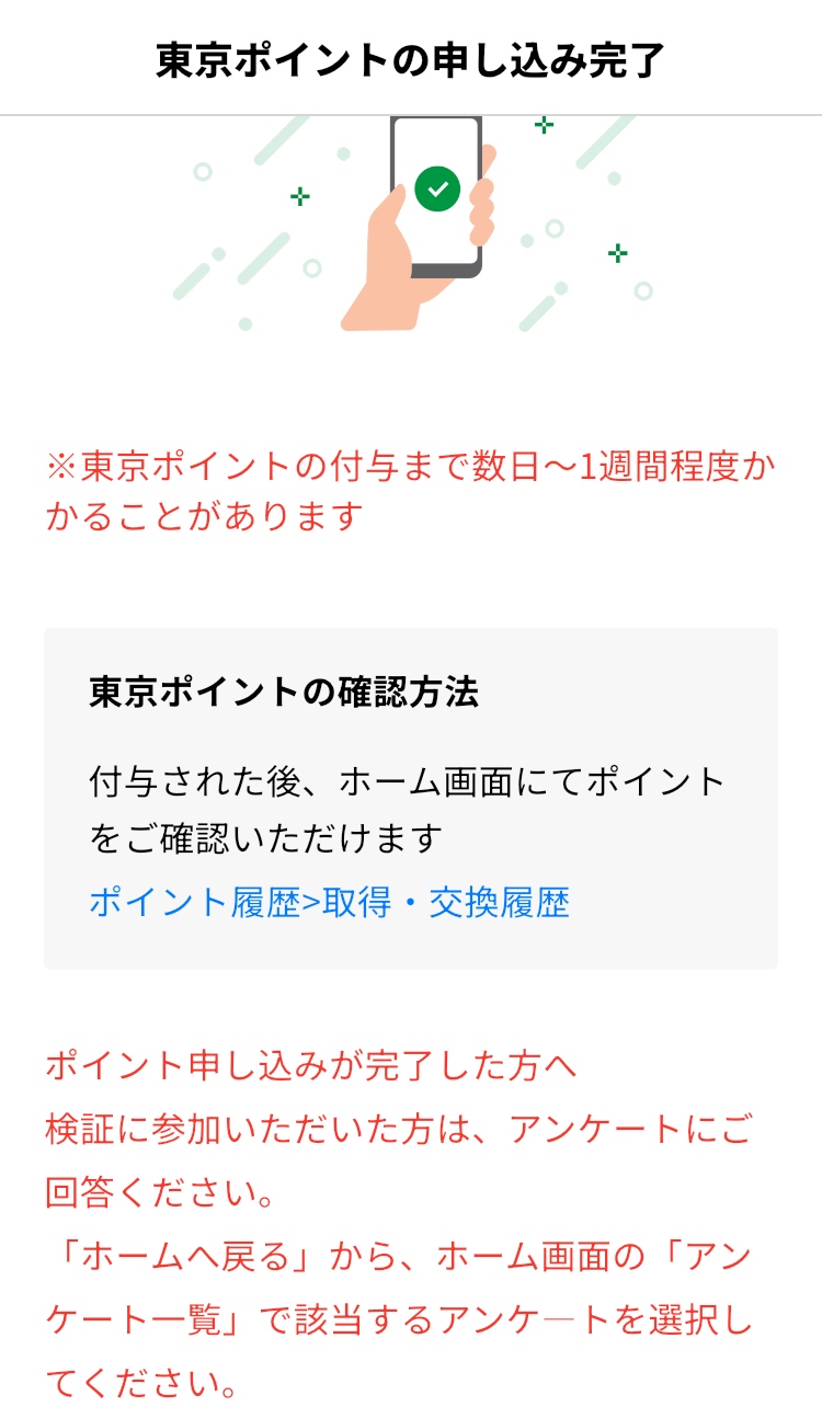 これらの手順を完了すると、500ポイントが数日から1週間以内に付与されます。処理が中断した場合、ホーム画面の表示(緑の「マイナンバーカード本人確認」またはオレンジの「東京ポイント申請」)に基づいて再開してください。