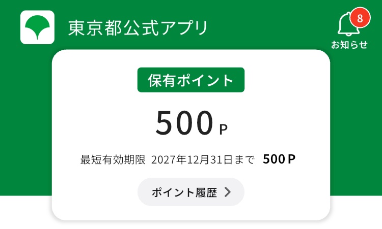 500ポイントは手続きが終わってから約1日半後くらいに「【東京アプリ】ポイント取得のお知らせ」なる件名のメールが届き、アプリを起動すると確かに500ポイント確認できました。